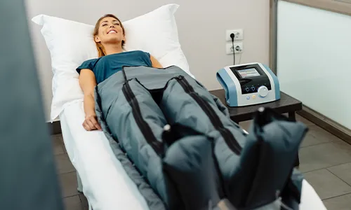 The Lympha Press® device applies pressure in sequence from the farthest (most distal) part of the limb, proximally towards the body. The pressure wave is created by up to 12 overlapping inflatable chambers inside a special garment, or “sleeve,” which is fastened around the area to be treated. Each chamber inflates in sequence, applying a smooth directional massage action that assists trapped lymphatic fluid to find its way to alternative, open lymphatic channels. Once the sequence is complete, the Lympha Press® releases the pressure, allowing the emptied lymphatics to refill. Then the process starts over again, and is repeated for the length of the prescribed treatment session.
